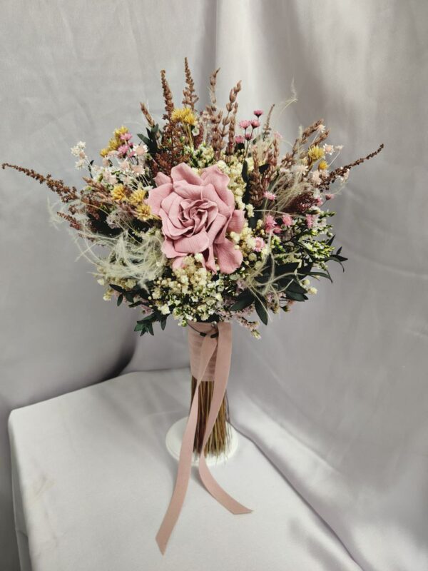 Cada detalle de este ramo ha sido cuidadosamente elaborado a mano, lo que le confiere un carácter personal y artesanal. Destacan las hermosas gardenias preservadas en un delicado tono rosa empolvado, que añaden un toque romántico y sofisticado.